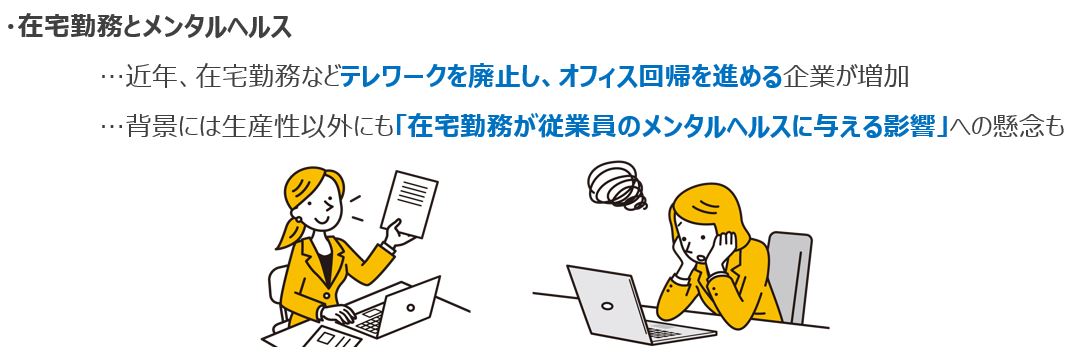 米国や日本の大手企業の間では、近年「オフィス回帰」の動きが目立ちます。これは、在宅勤務によるメンタル不調や生産性の低下を懸念しての動きでしょう。