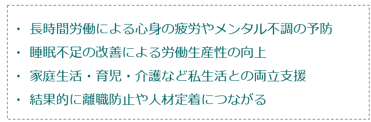 勤務間インターバル制度の最大の目的は、過重労働を防ぎ、働く人の生活と健康を守ることです。期待される具体的な効果は次のとおりです。