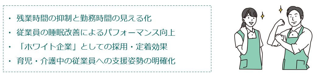 特に若手社員や女性従業員の採用で、「働き方に配慮してくれる会社」という印象を与える点はメリットとなるでしょう。