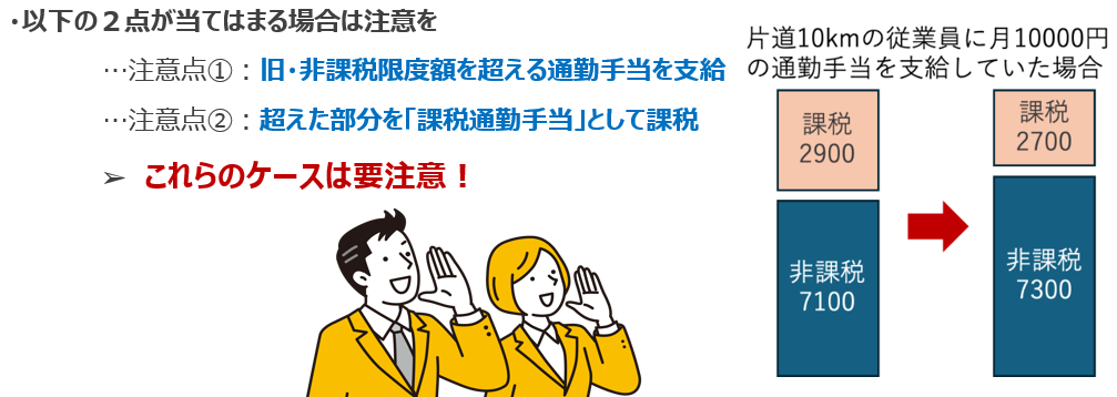 旧非課税限度額を超える通勤手当を支給しており、超えた部分を「課税通勤手当」として給与課税していた場合は注意が必要です。