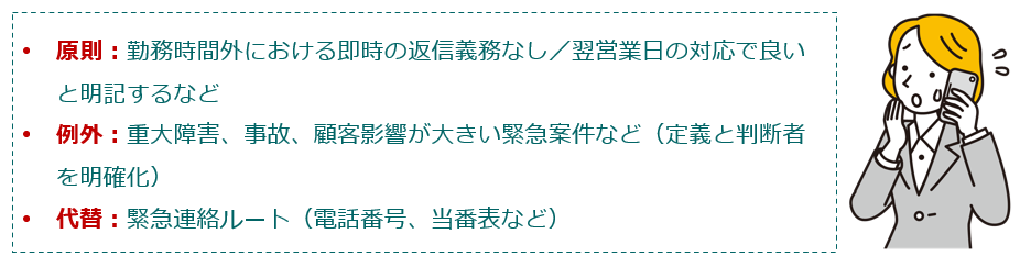 社内のルール以外に、対外的な説明も必要です。「当社は従業員の休息確保のため、原則として営業時間外の個別対応は翌営業日とします」「緊急時は24時間窓口(当番)へ。通常連絡はチャット/メールで受付します」などのルール説明をクライアントにするとよいでしょう。