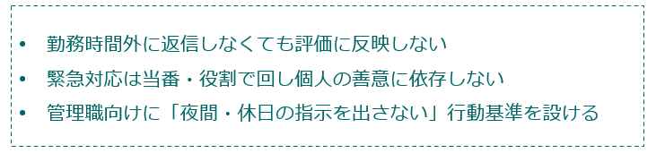 制度化で最も大事なのは、勤務時間外に反応しなくても直接的・間接的を問わず不利益にしないことです。実際「つながらない権利」の議論では、評価に影響するかもしれないという心理的圧力の取り扱いが鍵となります。社内ルールとして、以下のように発表し実行力を高める方法があります。