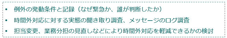 営業時間外の対応事案を記録し、定期的に次のような内容を調査し、検証、評価も重要でしょう。