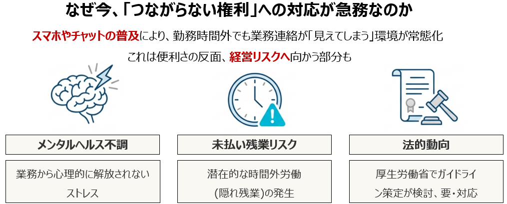 チャットツールやスマートフォンの普及により、「勤務時間外でも業務連絡が見えてしまう」環境が当たり前になりました。便利さの反面、私生活でも業務から完全に解放されないためメンタル不調や、潜在的な時間外労働(不払い残業)の発生等が問題視されています。以下、近年ガイドライン策定も検討されている「つながらない権利」について、どのように実務的な制度をつくれば機能するか考察します。なお、現時点で「つながらない権利」は日本の法律上明文化されていませんが、厚生労働省でガイドライン策定が検討されており、今後の動向を見据えた対応が求められます。