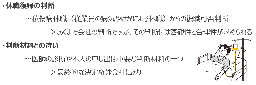 私傷病休職(従業員の病気やけがによる休職)からの復職可否を判断するのはあくまで会社ですが、その判断には客観性と合理性が求められます。