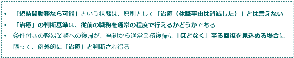 ある最近の裁判例(T社事件・東京地裁令和5年12月7日判決)では、主治医の診断書に「当初は4時間勤務から開始し、その後2か月程度で定時勤務に戻すことが望ましい」との条件が付された場合の復職判断について検討され、裁判所は次のポイントを明確にしました。