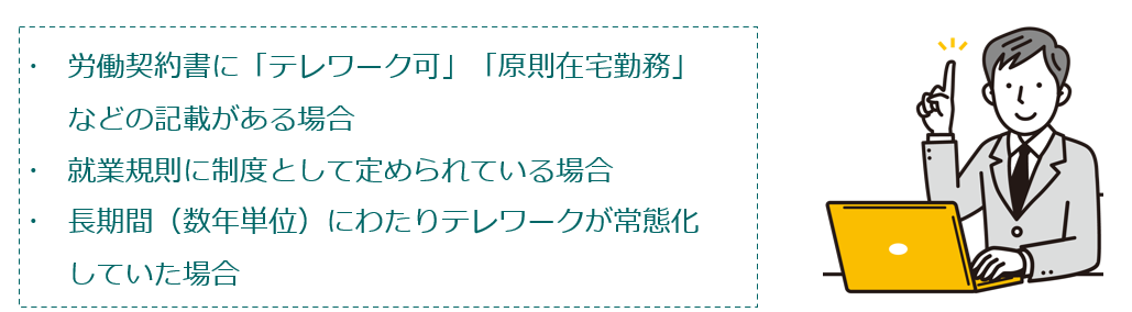 テレワークから出社への切替えも、実質的には「労務提供場所の変更」と評価される可能性があります。特に育児・介護などを理由に在宅勤務を前提とした生活設計をしていた労働者に対しては、不利益性が大きいと判断されやすい点に注意が必要です。