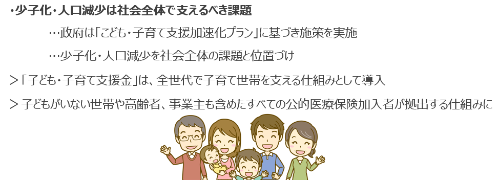 政府は「こども・子育て支援加速化プラン」に基づき、少子化・人口減少を社会全体の課題と位置づけています。この「子ども・子育て支援金」は、全世代で子育て世帯を支える仕組みとして、子どもがいない世帯や高齢者、事業主も含めたすべての公的医療保険加入者が拠出する仕組みとなっています。